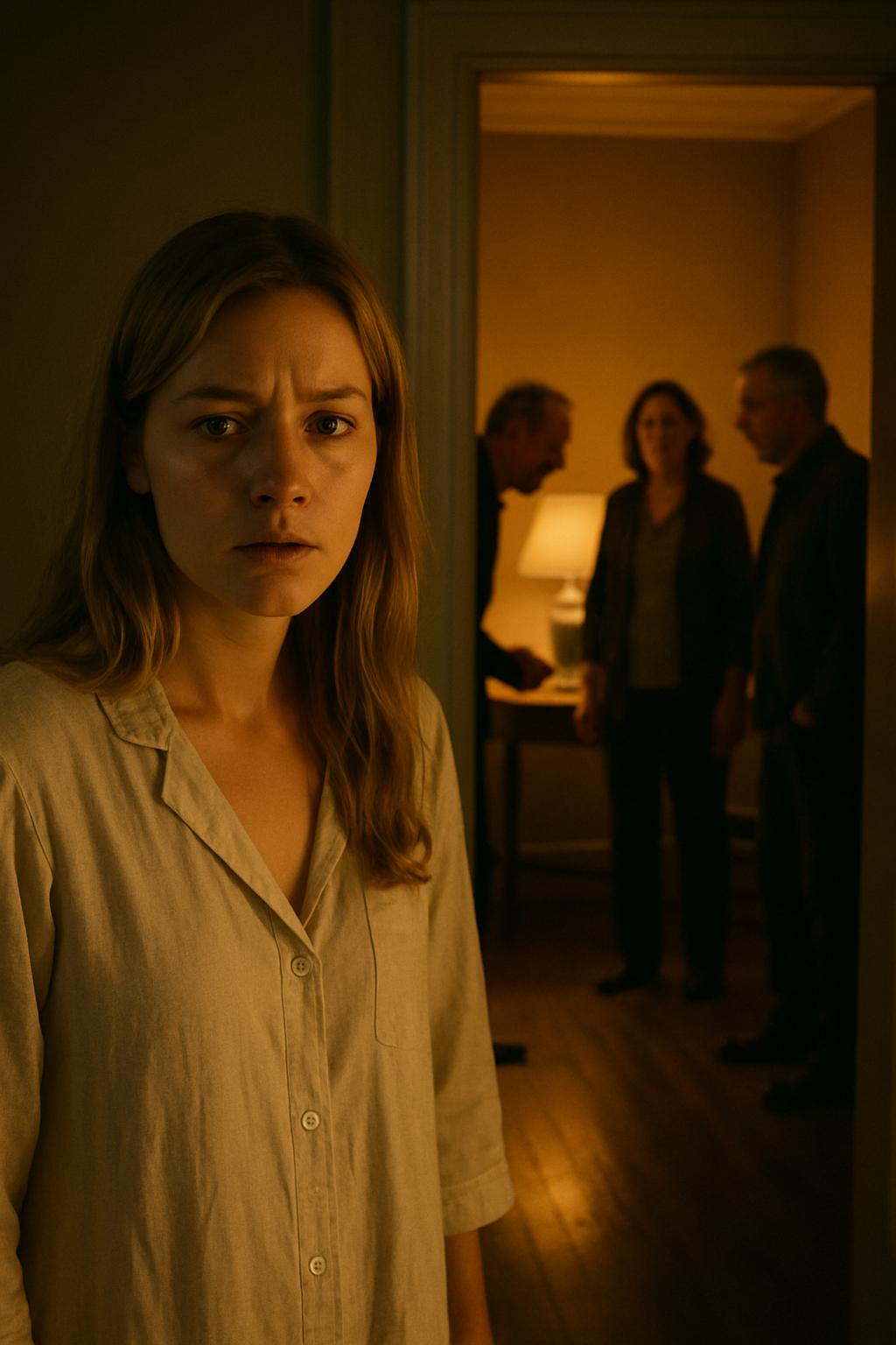 Σηκώθηκε, φόρεσε τη ρόμπα της και κατευθύνθηκε προς την κουζίνα για νερό. Το νυχτερινό φως έριχνε σκιές στον διάδρομο, το πάτωμα έτριζε.